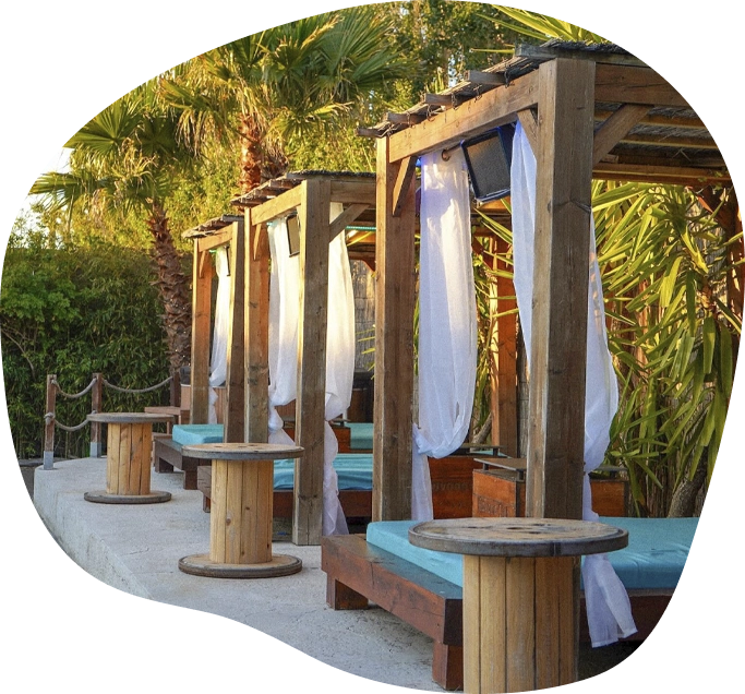 Sur un matelas moelleux, ombragé par un voile léger ou au soleil, chaque bed vous invite à un moment de détente absolue un cocktail à la main.